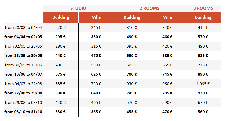 Weekly rates (from Saturday 3PM to Saturday 9.30AM) including facilities and garage or parking spot